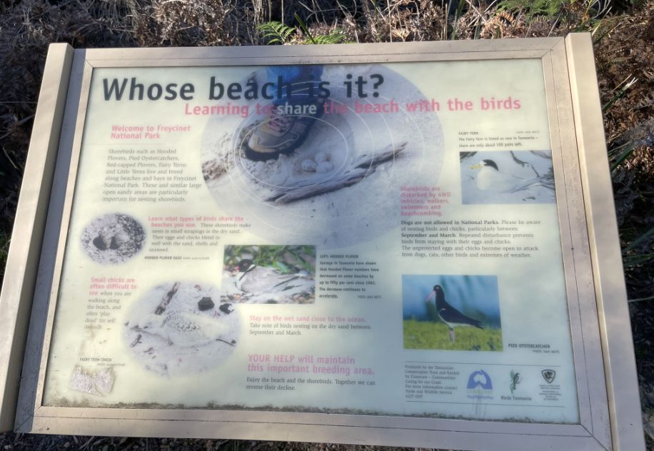 A panel informing visitors to learn to share the beach with birds. Shorebires such as Hoodre, Plovers etc.. make nest in small scarping in the dry sand. their eggs and chicks blend in well with the sand, shells and seawwed, and people should not disturb them so they can stay with their eggs and chicks.
