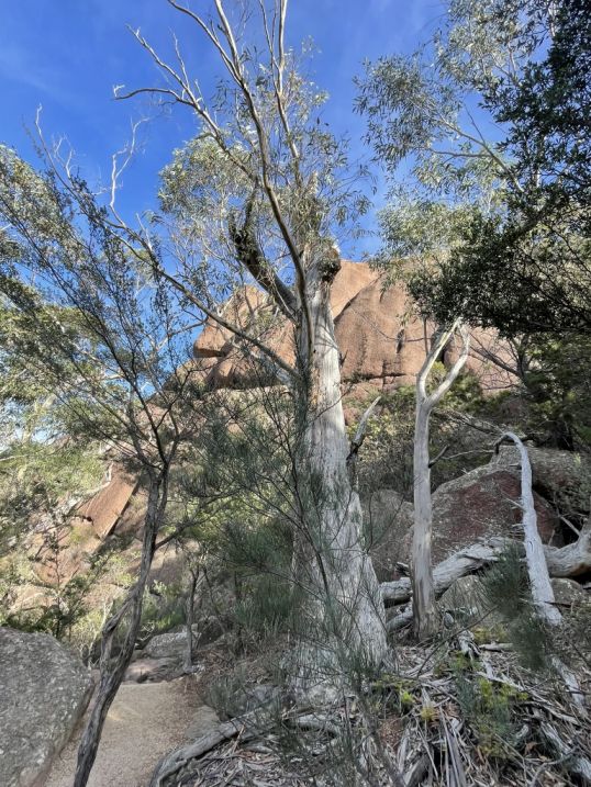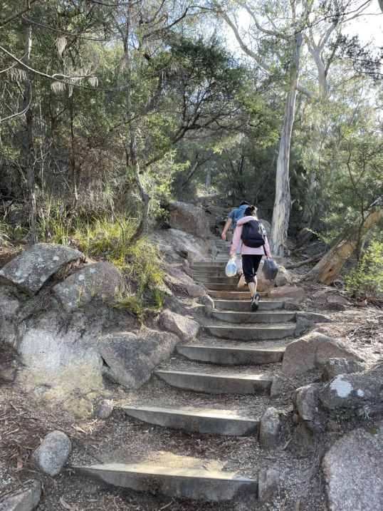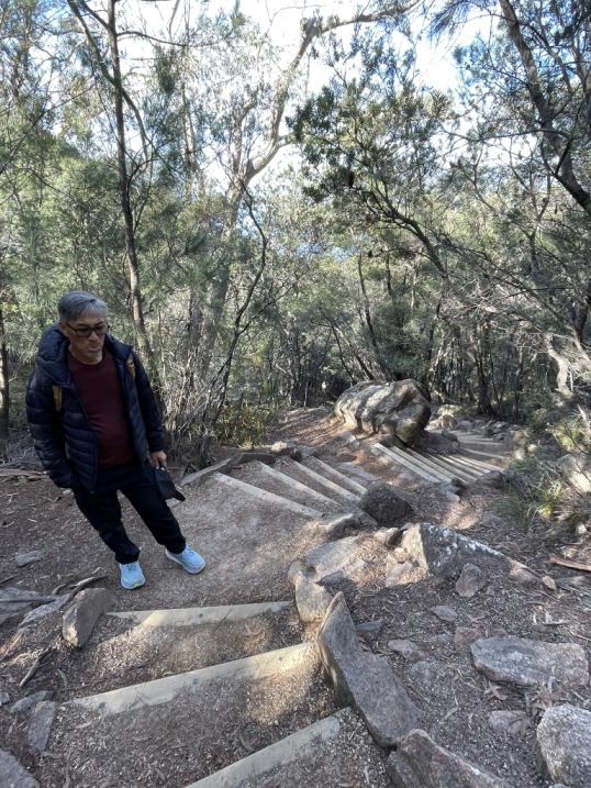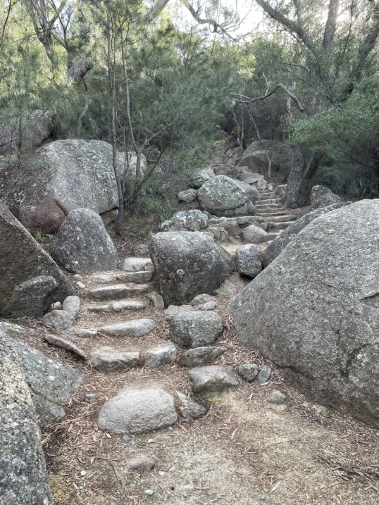 The stairs twist and turn through granite outcrops and tall eucalypts, with occasional breaks where we can catch our breath ,