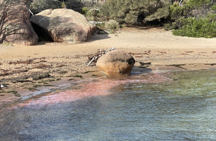 On the beach, a large rounded boulder sits near the water’s edge, its smooth surface catching the soft light. Just beside it, the shallow water shimmers with a pinkish hue. The pinkish hue in the water at Honeymoon Bay is not due to the water itself, but is a reflection of the peninsula's famous pink granite.