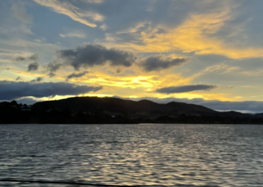 The reflection of the sky shimmered on the still water of the lagoon, creating a peaceful, almost dreamlike scene. It was the perfect ending to our journey, a calm, golden farewell to five unforgettable days in Tasmania.