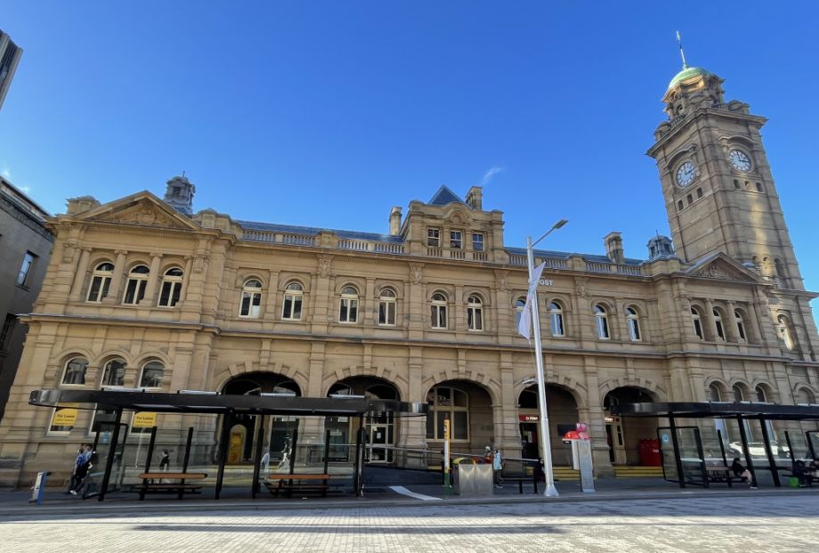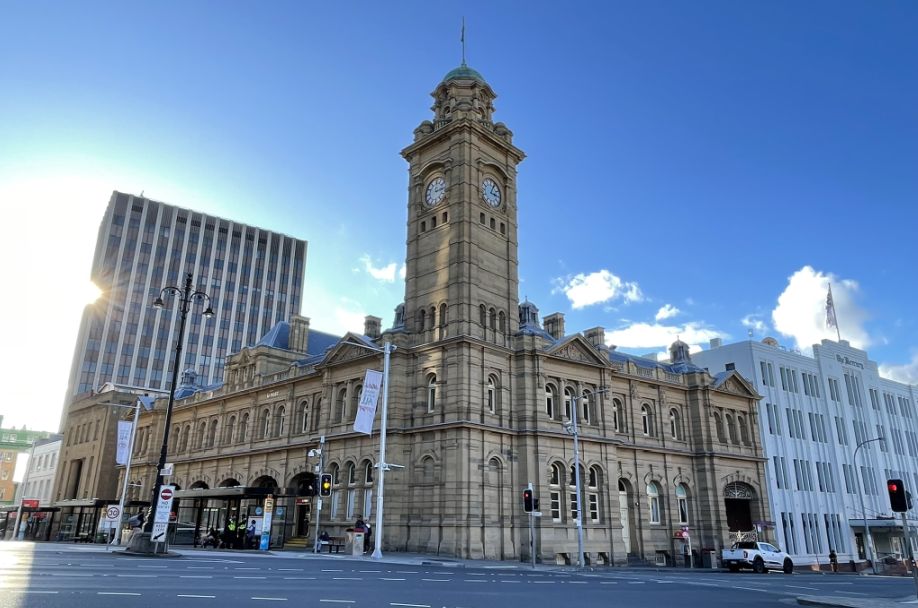 The General Post Office building stands proudly at the corner of Elizabeth and Macquarie Streets, its sandstone façade glowing a soft golden hue in the Tasmanian light.