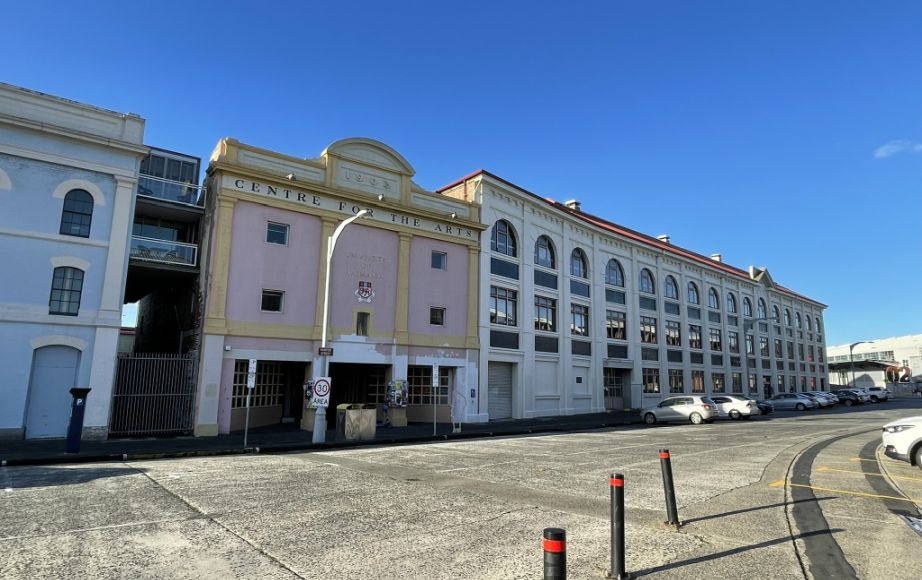 We are now right in the Hunter Street precinct, one of the most vibrant and historic corners of Hobart’s waterfront. The pink building is part of the University of Tasmania’s Centre for the Arts, which houses studios, exhibition spaces, and classrooms for visual and performing arts students. Right next to it is the Tasmanian Museum and Art Gallery (TMAG) complex. The glass façade you see is part of its modern extension, which connects beautifully with the older 19th-century buildings behind it.