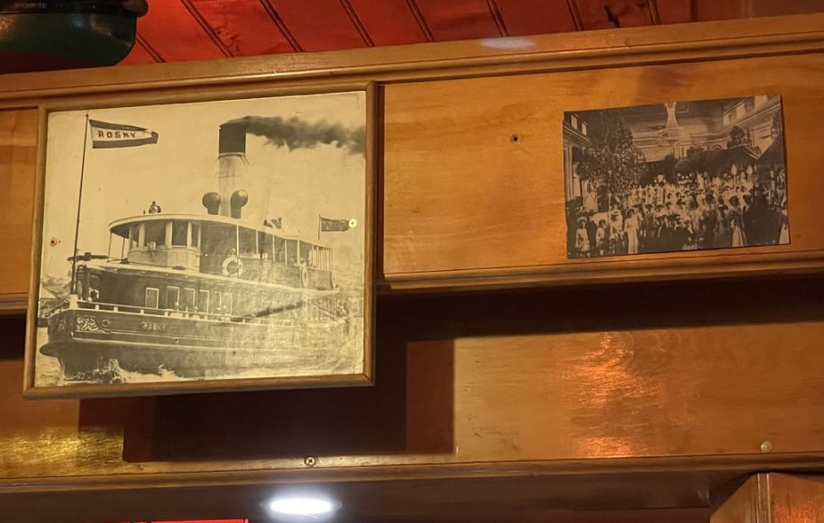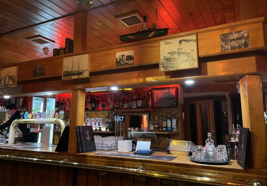 Pictures of old ship wheels, framed maps, and antique bottles displayed along the walls and shelves, a reminders of the days when sailors and traders made this their regular stop.