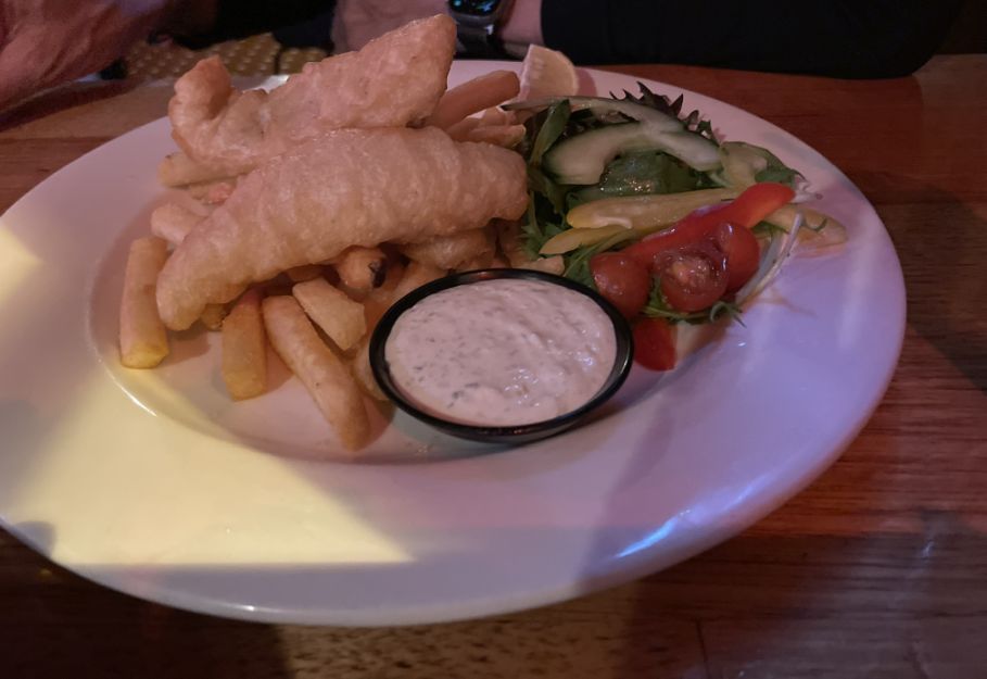 Fish and chips, tartare sauce, and salad were equally inviting with a generous fillet of local white fish, lightly battered to a crisp golden finish, paired with thick-cut chips and a side of tangy tartar sauce. The fish was delicate and flaky inside, the batter perfectly crunchy, and a squeeze of lemon brought out its fresh ocean flavor.