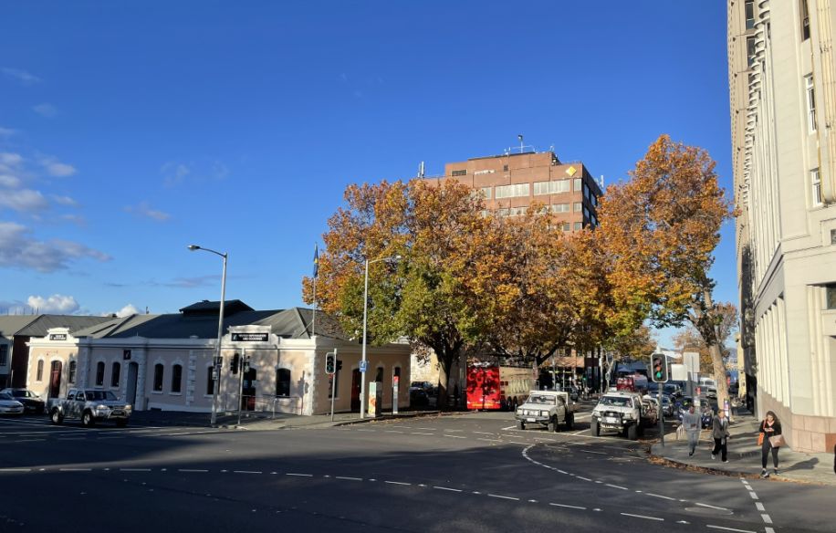 We are right in the heart of central Hobart, where the historic charm of the waterfront gives way to the city’s modern commercial core. The area between Collins Street and Argyle Street is one of the busiest and most built-up parts of town, lined with tall office towers, hotels, and civic buildings that define Hobart’s small but vibrant skyline.