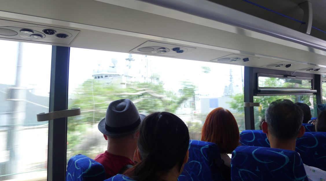 Our tour guide led the way and we are now walking to the bus. The tour is about 3 hours and it will stop at a few places.