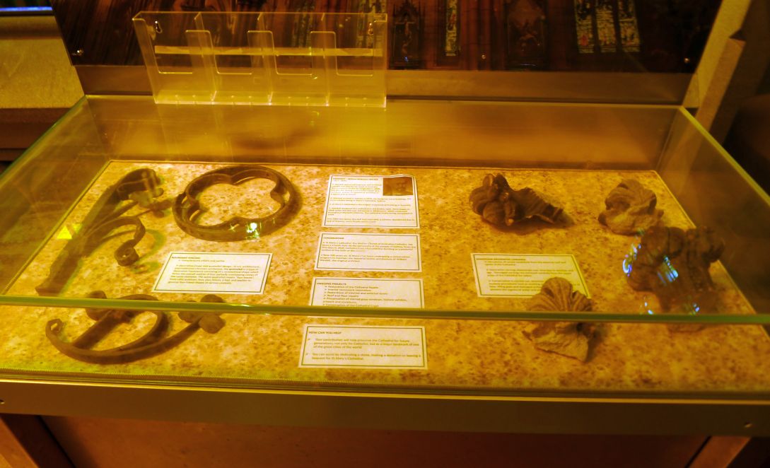 Display case including metal decorative design and remains of sandstone decorative carvings.