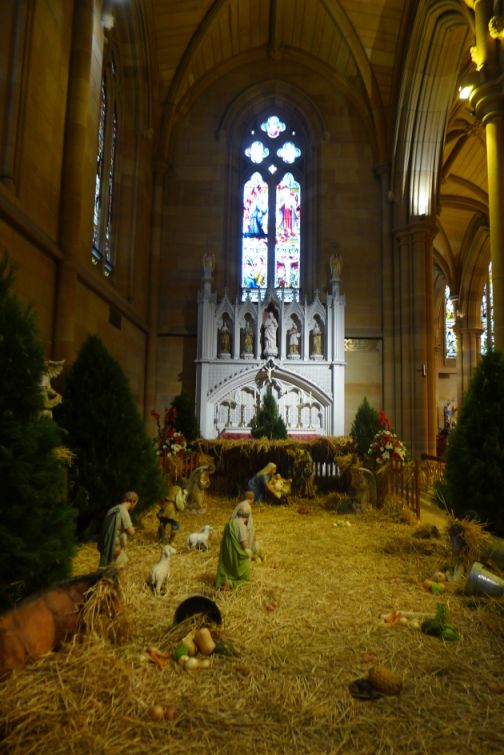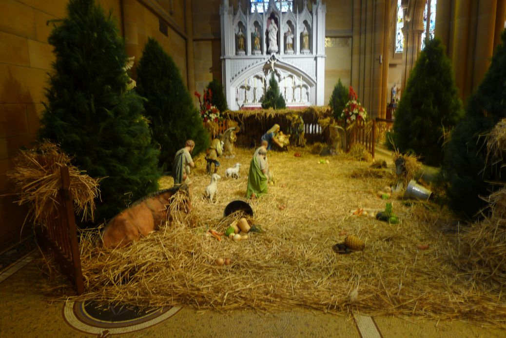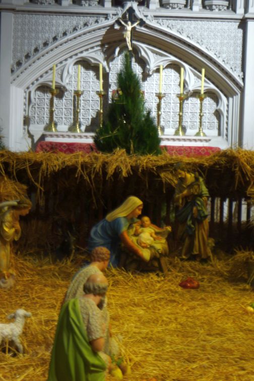 As you walk in the door, on the immediate left there is a huge nativity scene in the Chapel of the Sacred heart.