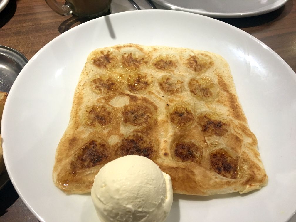 We ordered the famous Roti Canai (savory) on the left served with 2 curry dips and Sambal sauce, and on the right is the sweet roti with ice cream.