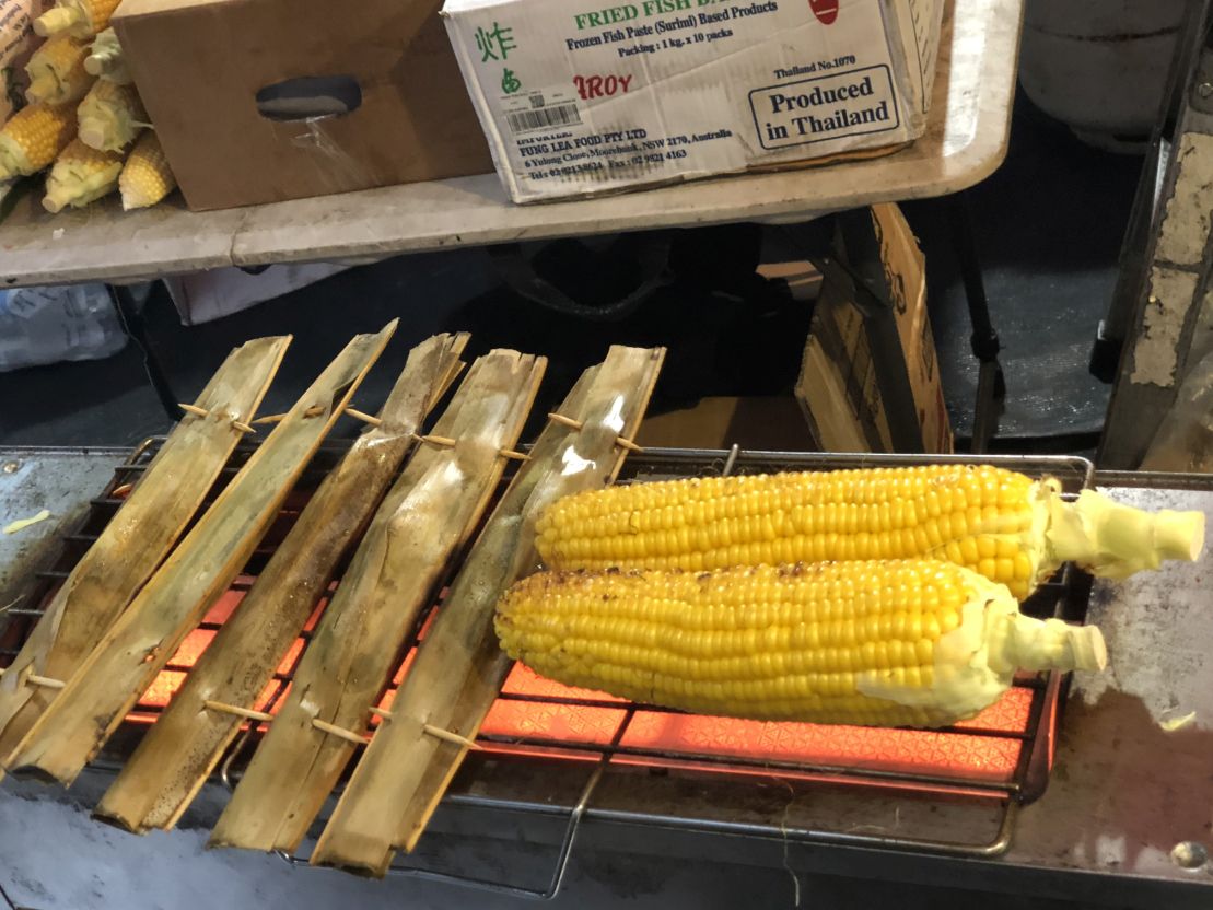 Grilled corn, and grilled banana cake wrapped if leaves.