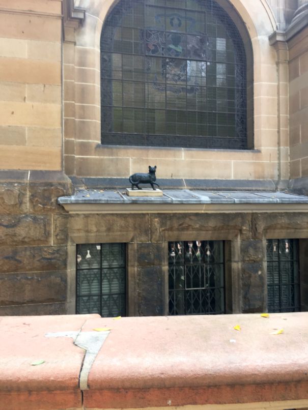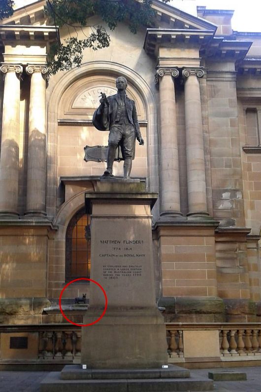 Perched on a window ledge behind the statue of Captain Matthew Flinders and great explorer's little companion is the ship's cat called Trim.