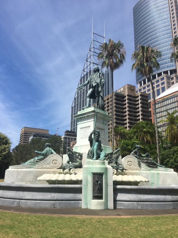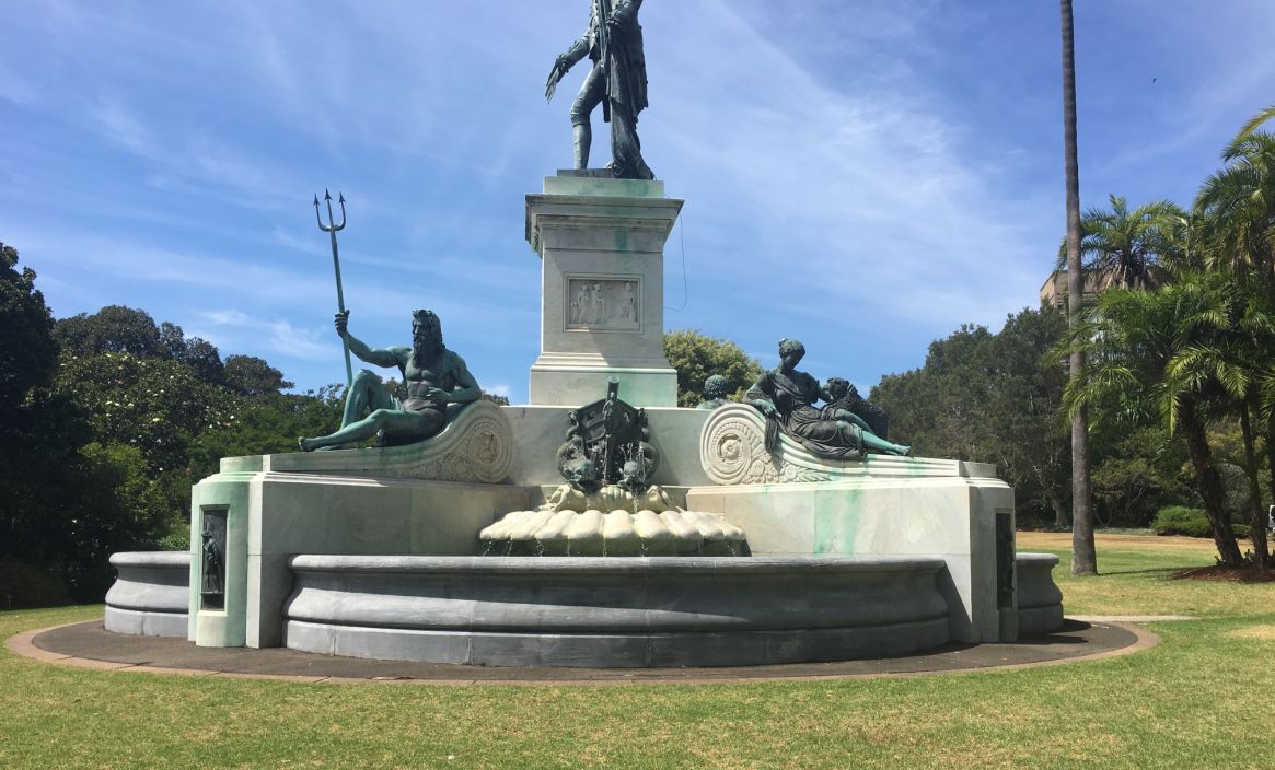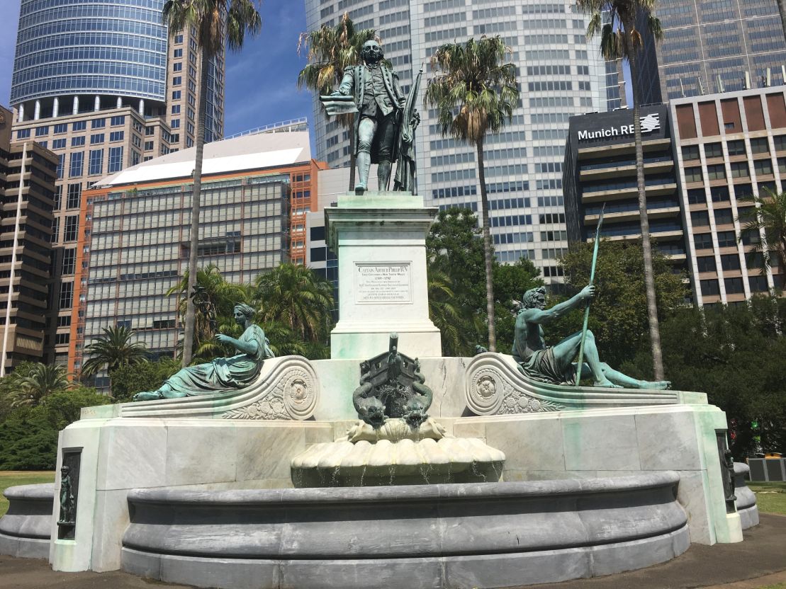 Governor Phillip Fountain is located at the south end of the Botanic garden, close to Macquarie Street. It was created by the Italian sculptor Achille Simonetti and unveiled in 1897 to honor Captain Arthur Phillip, the first Governor of New South Wales. This magnificent 15.24 meter high fountain features a marble pedestal for the 4.5 meter bronze statue of Captain Phillip.