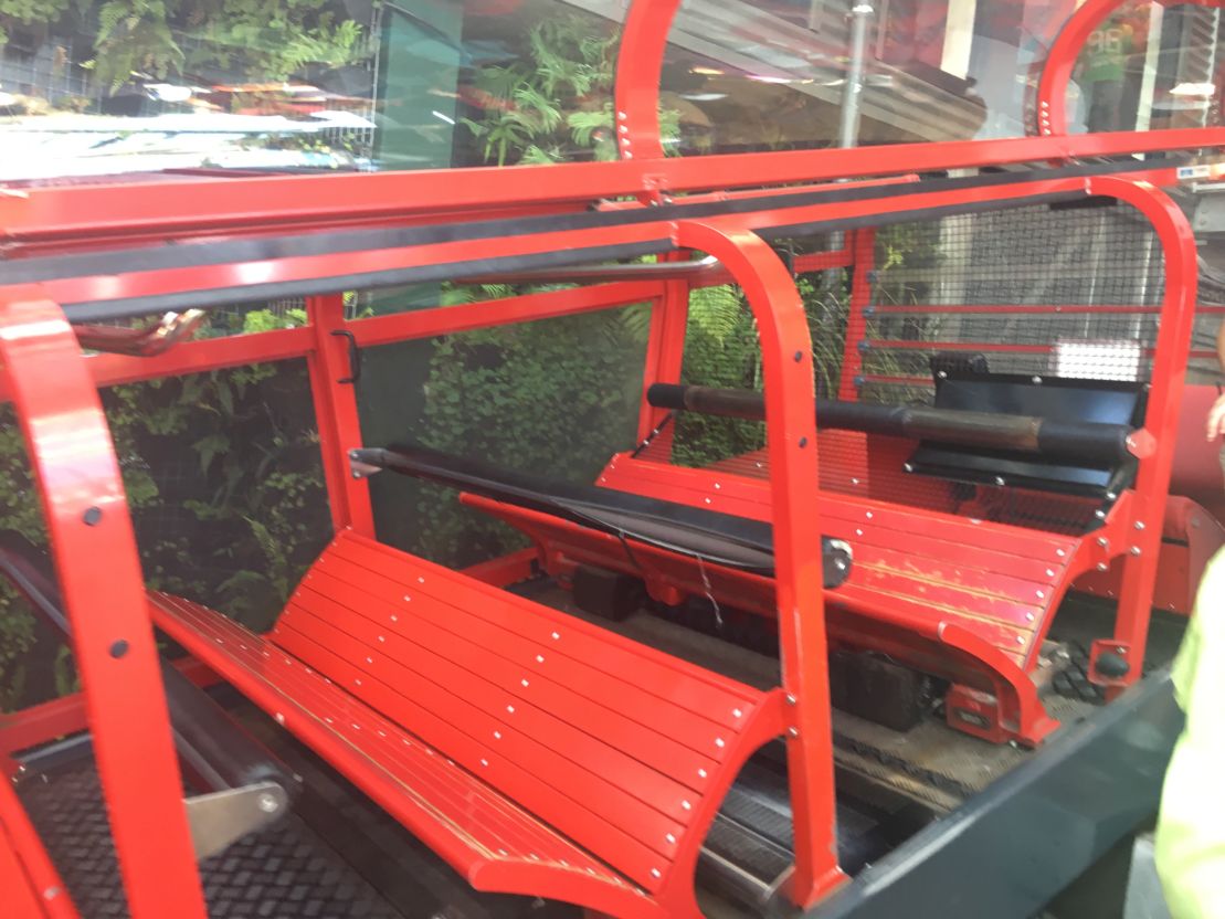 Passengers can choose the position of their seat by adjusting up to 20 degrees. Choose CLIFFHANGER at a steep 64° incline; LAIDBACK for a more relaxed journey; or for loyal fans, ORIGINAL at 52°. I don't remember what position we choose but it was a scary ride.