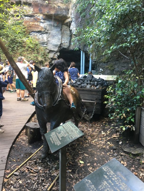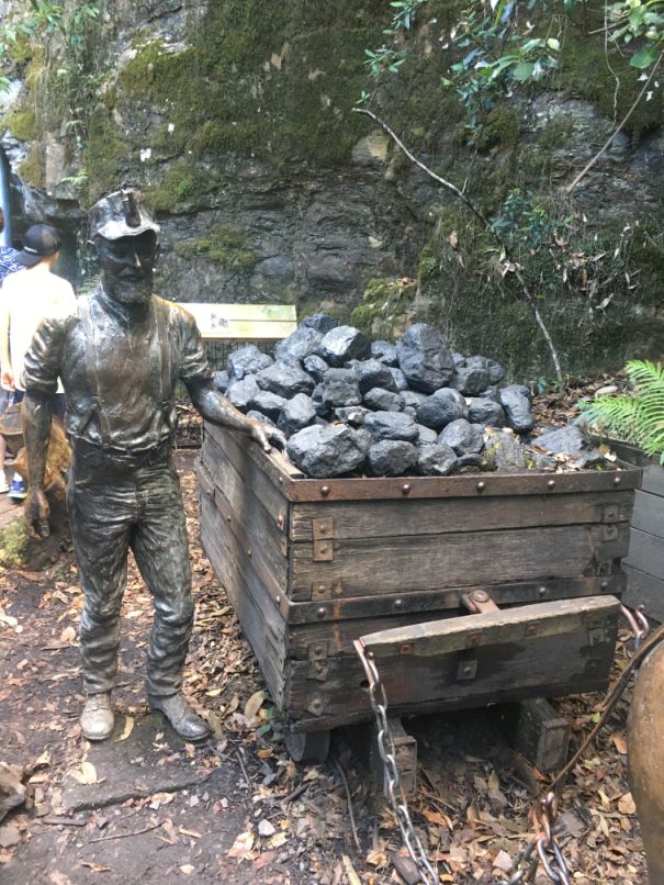 In front of the Coal mine there is a sculpture of a miner and his donkey hauling the coal in a wagon.