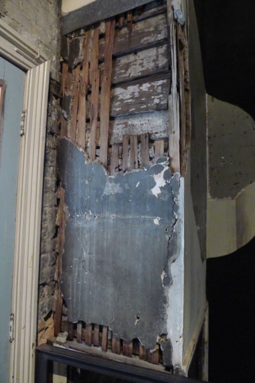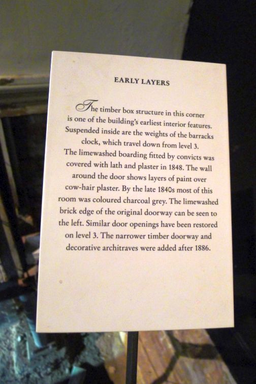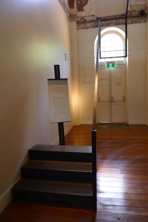 The ghost stair is am abstract line tracing the handrail of the original stair. It links three approaches to building conservation & historical interpretation: Level 1 modern adaptation for exhibition, level 2 exposed layers of historical use, level 3 theatrical reconstruction of convict past. All conservation processes use evidence to uncover the past in different ways.