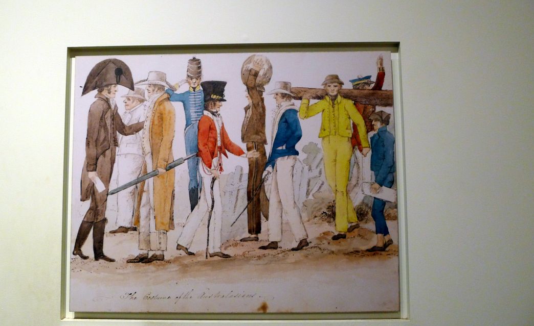 Picture left to right are various member of convict Sydney society: a government official, an emancipist or ticket-of-leave man, an "exclusive" free settler, a government convict, a free settler, a government convict, a officer of the 73rd regiment and a convict overseer.