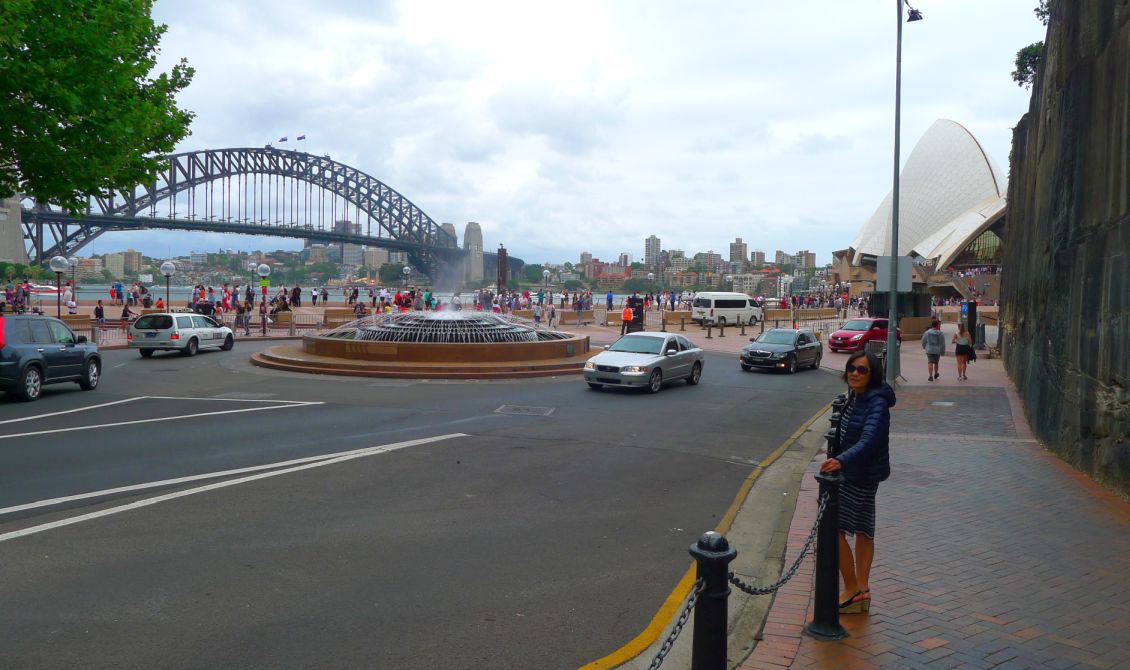 We are now on Macquarie street. In the middle is a large fountain and it is near the entrance of the Opera House.