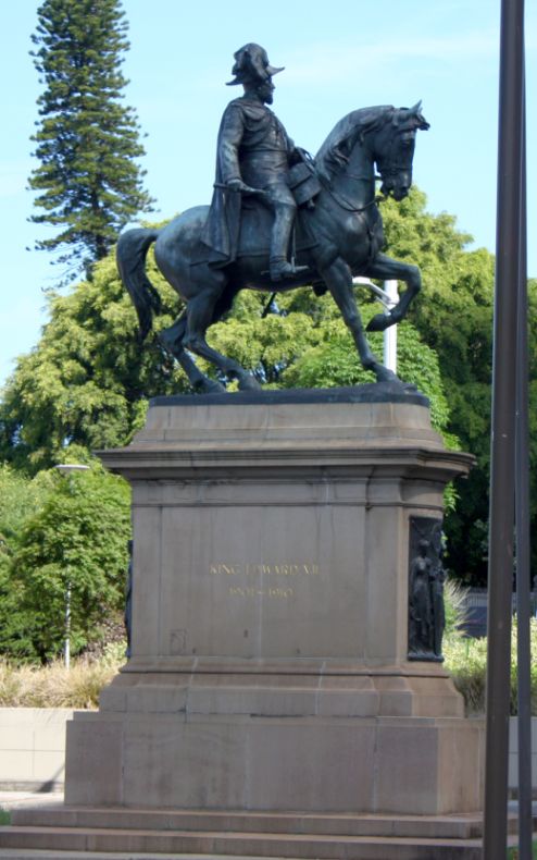 This bronze memorial statue of Edward VII, in full military uniform, on its sandstone plinth with a number of bronze reliefs emphasizing the importance of Empire to Australia was created by Thomas Brock (1847-1922), one of Britain’s most prominent sculptors of the era. Brock’s most recognized work would have to be the central monument in the Victoria Memorial at the front of Buckingham Palace in London.