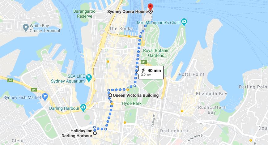 From the Holiday Inn in Darling harbor, it takes a good 40 minutes walk to the Opera house. We had plenty of time and this is a great way to discover down town Sydney.