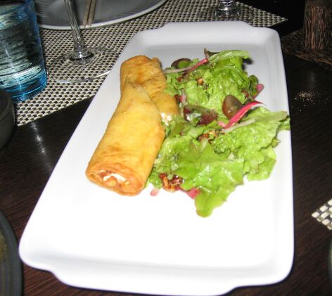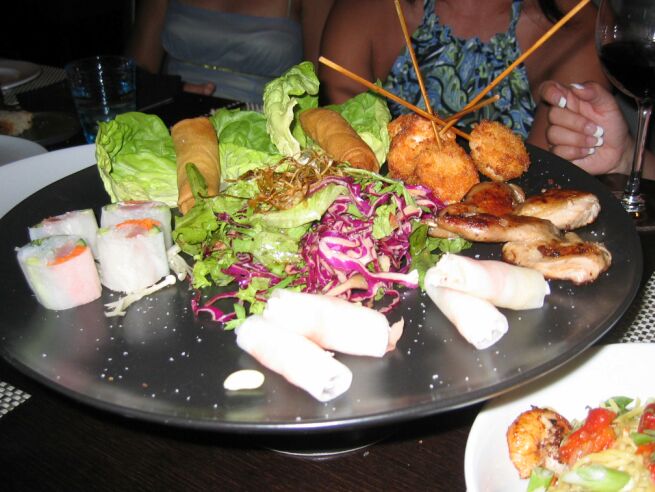 This is called the Black Plate (for 2 people). On the plate you will find Quail with Thai spices, Crab Spring roll, Shrimp Satay, Lobster Daikon, and Tuna in Rice Paper. |