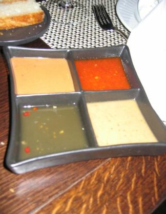4 kind of Sauces to go with the black plate! The 1st one is a Tamarin sauce, the 2nd one is sweet and sour, the 3rd one is Nuoc mam pha, and the 4th one is nuoc Mam with ginger. Hoa was surprise to see Nuoc Mam in a French restaurant ! |