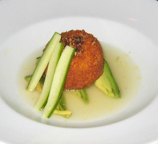 Crab Cake with Avocado, cucumber, Lime and Crystalized Ginger |