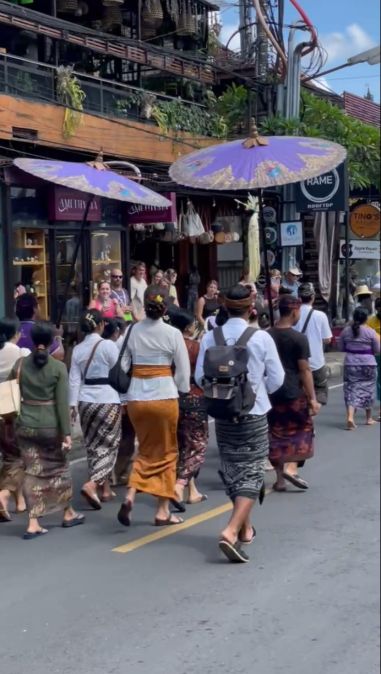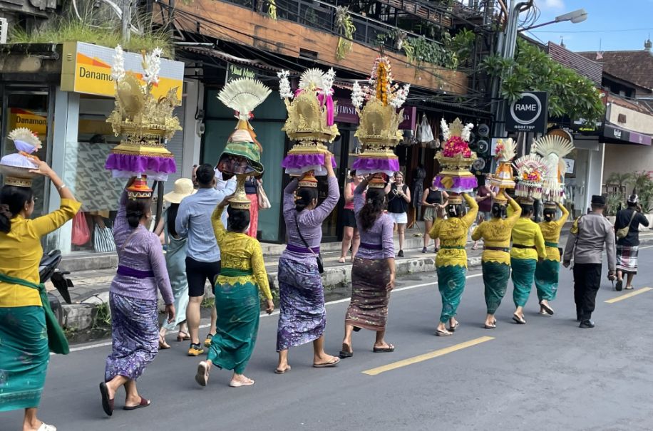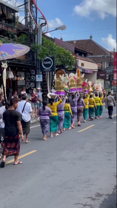 In the middle of the street we witnessed a Balinese ceremonial procession, a beautiful and very typical sight, especially in the morning. These processions often happen when a village group is headed to a temple for a ceremony or festival. In Balinese culture, women lead many ceremonial processions, carrying tall offerings on their heads, a practice called “Gebogan”.