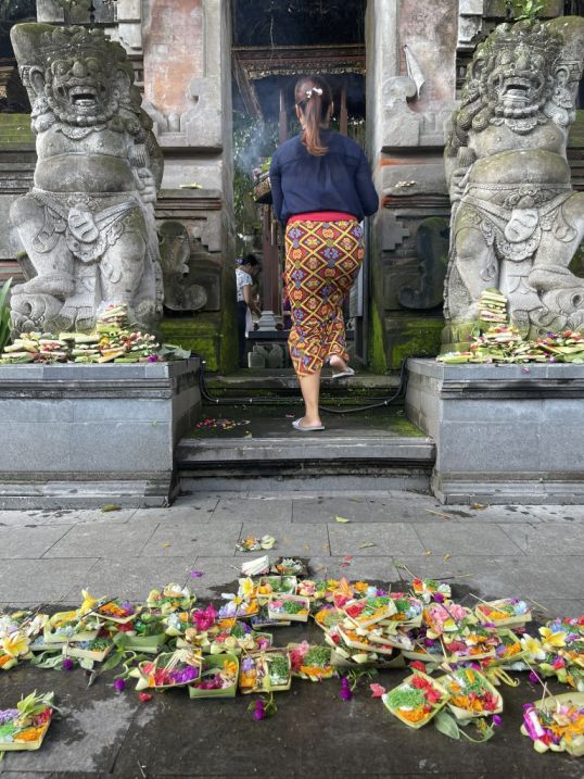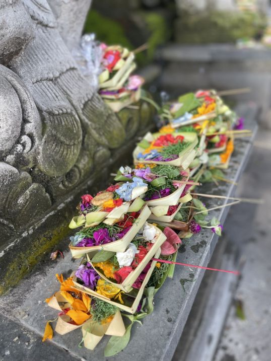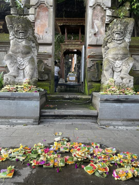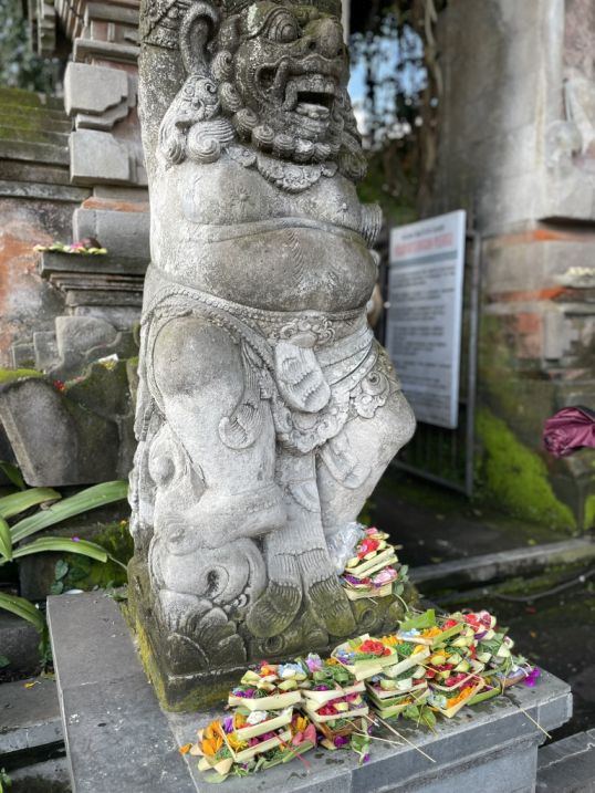 Balinese people place offerings, called canang sari, at the feet of these guardians for several reasons: