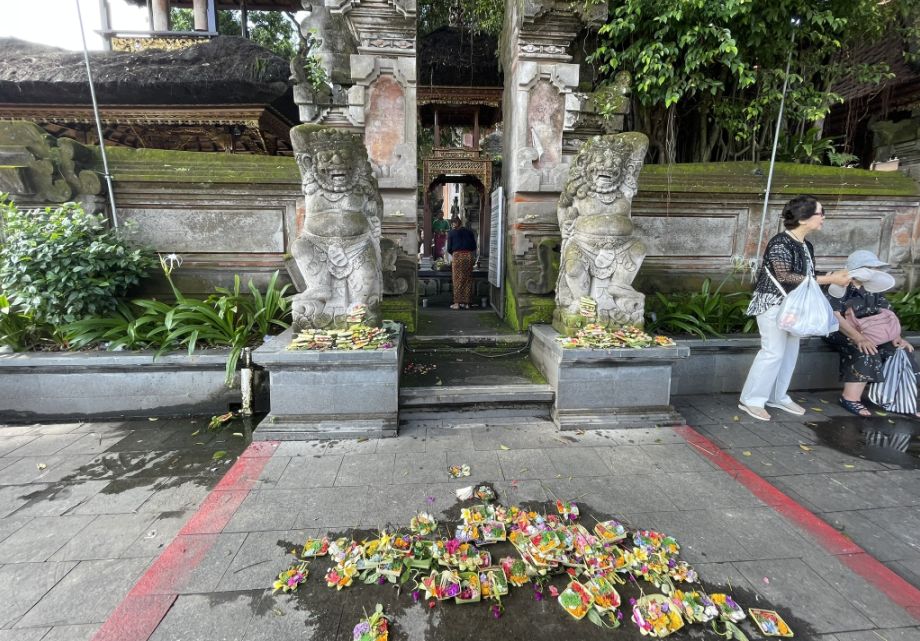 At a large entrance like the market, you’ll see many dozens of canang sari spread out because each shop owner places their own offering.
