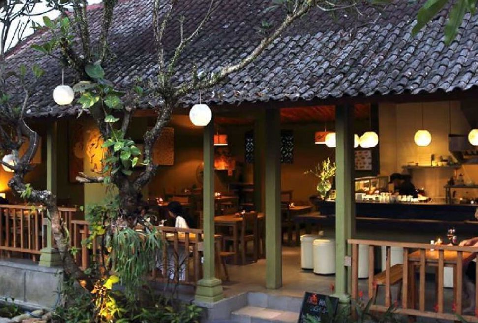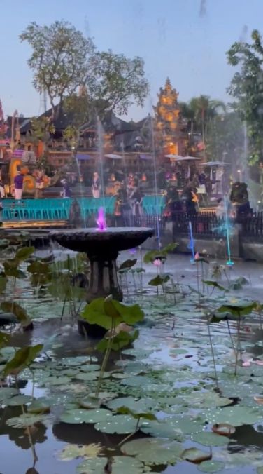 The cafe is set right next to a magnificent, large water garden pond in front of the Saraswati temple.