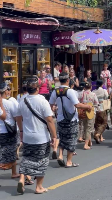 A traditional Balinese gamelan marching ensemble usually follows at the end of the procession. We heard gongs, drums, cymbal, and bamboo instruments. It is actually pretty low so everyone is stopping to watch the procession.