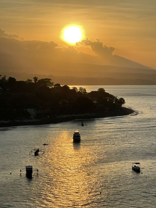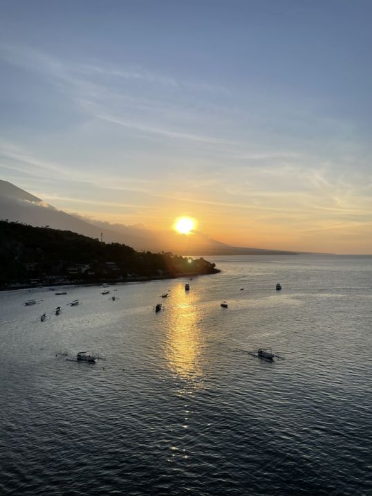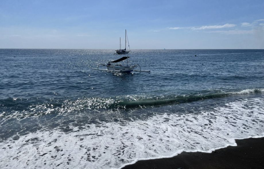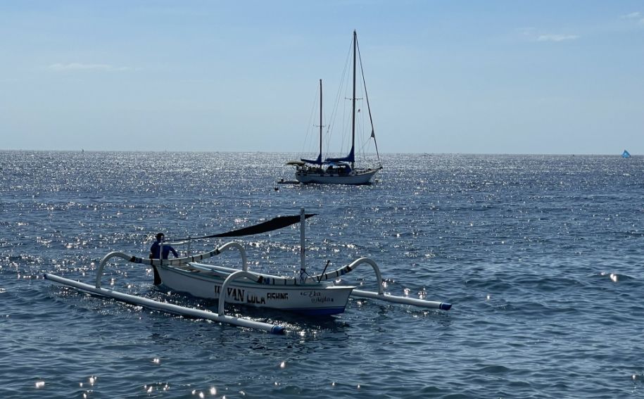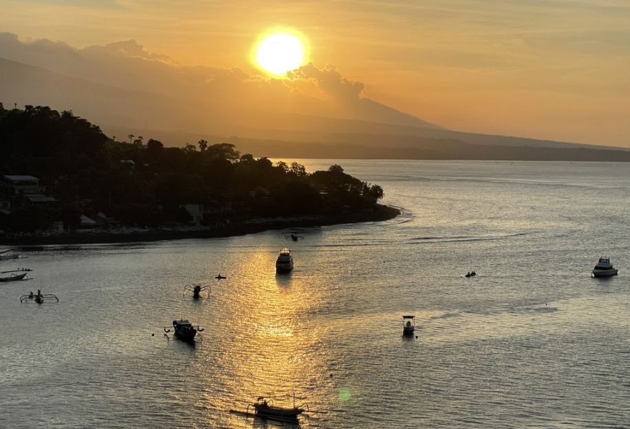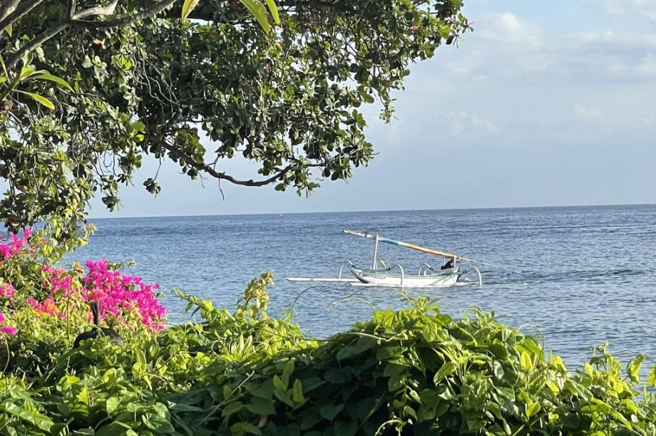 The next morning, we woke up early and walked past the swimming pool, where the view opened straight out to the Bali Sea. The water was calm and softly lit by the morning light. Out on the sea, we could see many small individual boats heading back toward the shore, moving slowly and quietly across the surface.