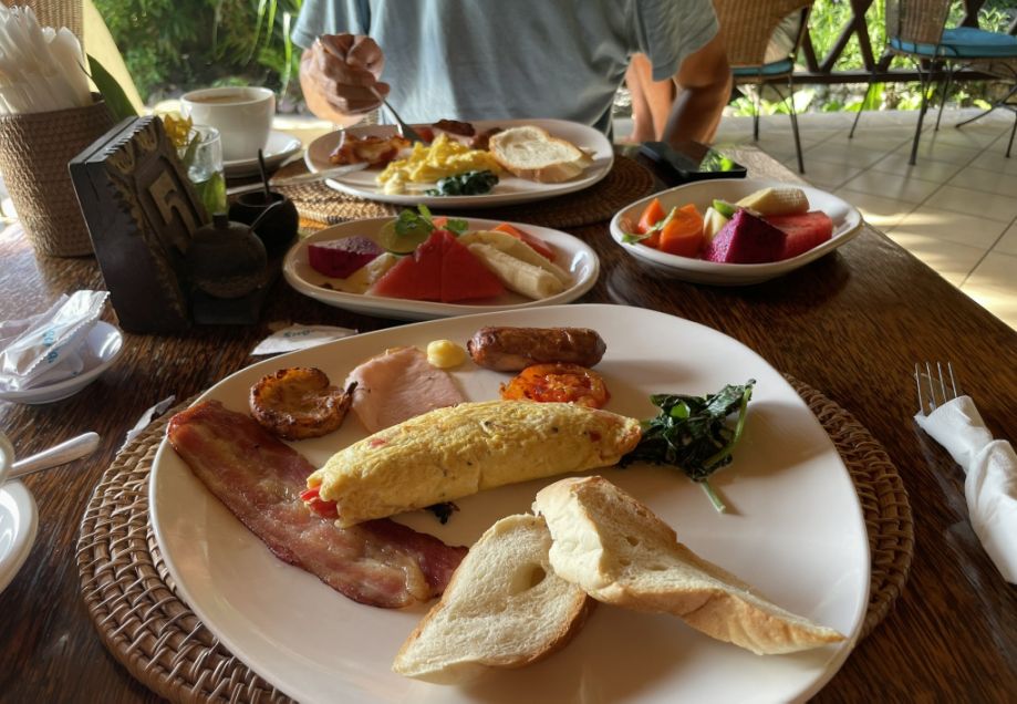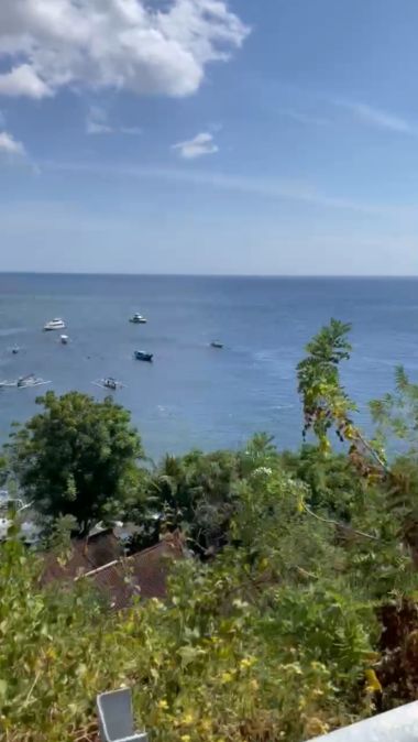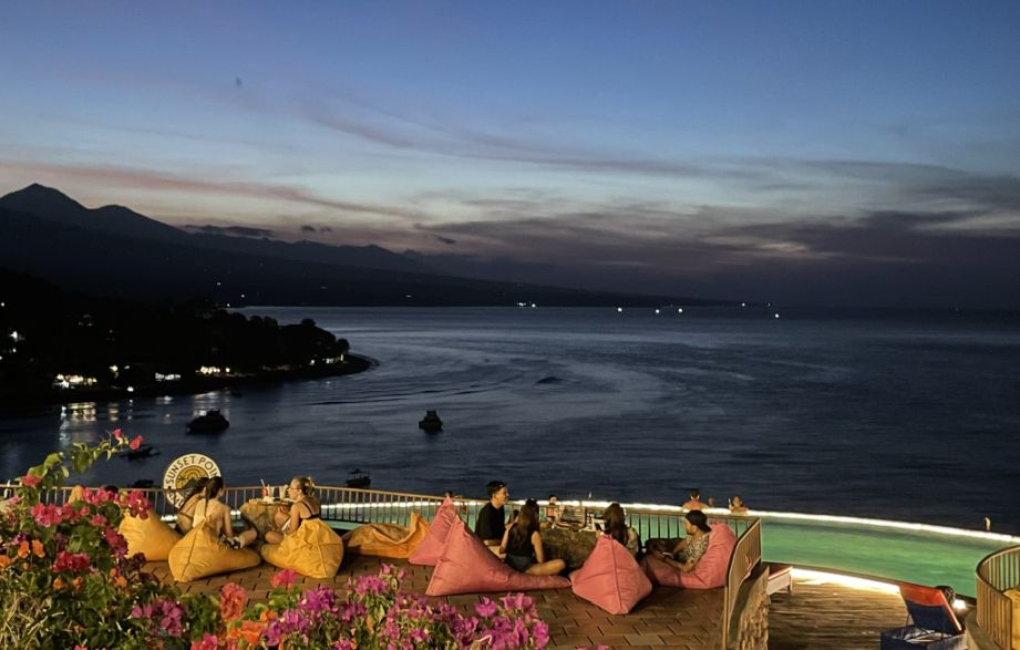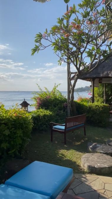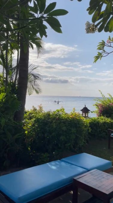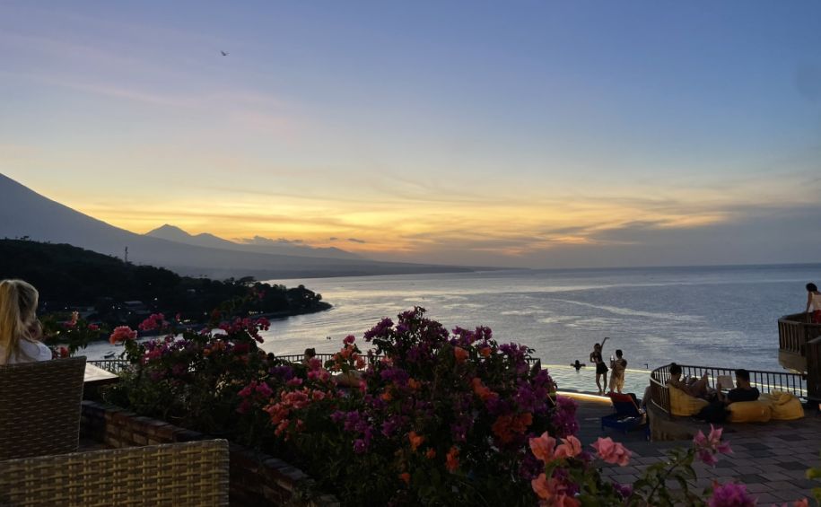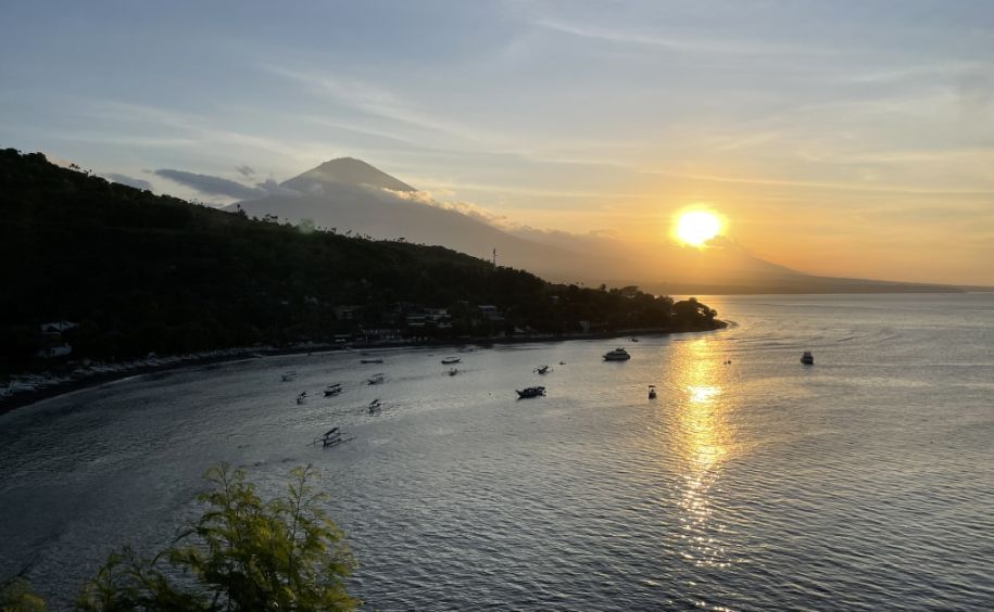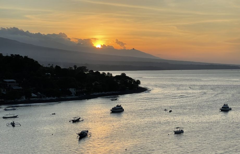 The next morning, we woke up early and walked past the swimming pool, where the view opened straight out to the Bali Sea. The water was calm and softly lit by the morning light. Out on the sea, we could see many small individual boats heading back toward the shore, moving slowly and quietly across the surface.