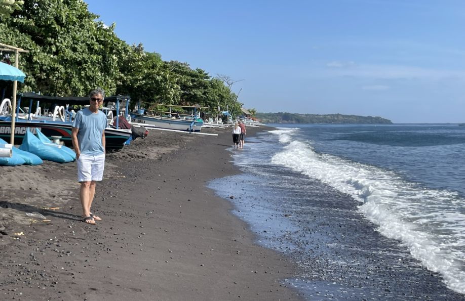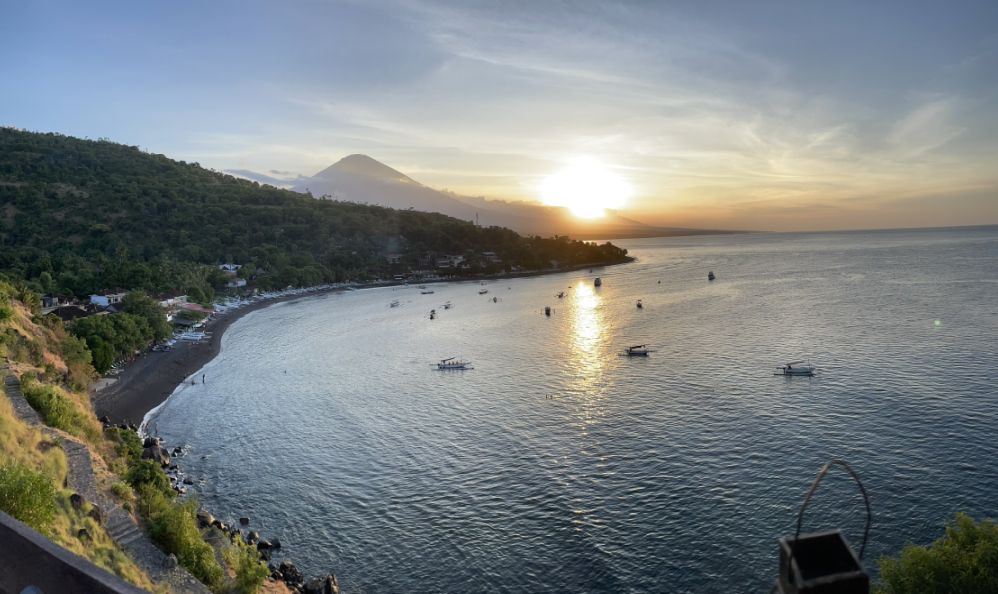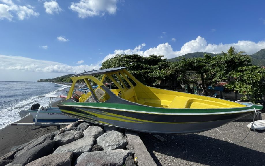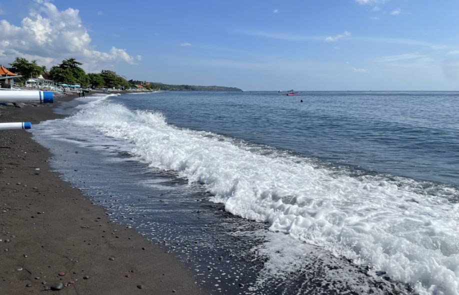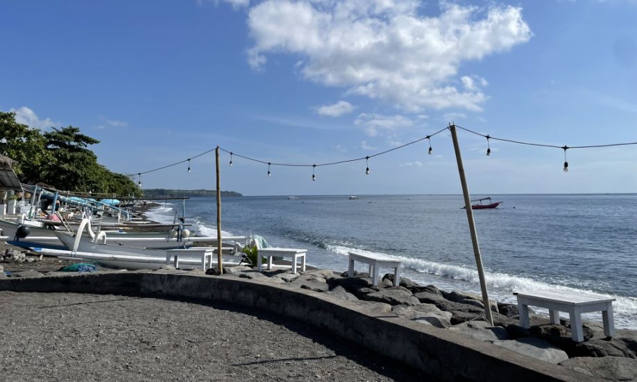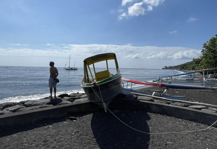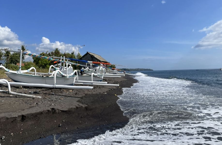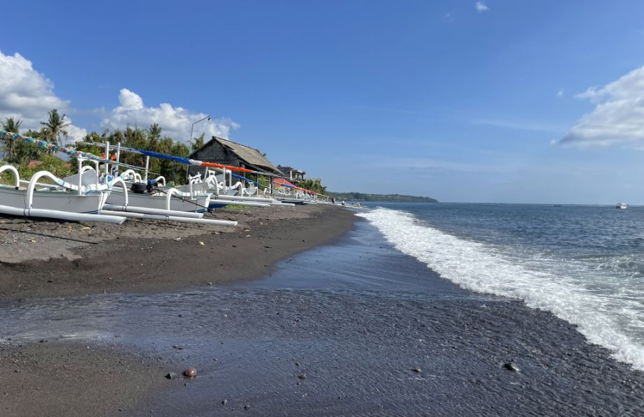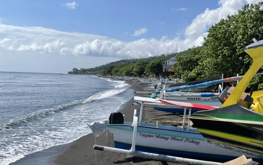 Amed Beach feels especially quiet and unhurried. The shore on the right was lined with fishing boats pulled up onto the black sand, resting between trips out to sea.