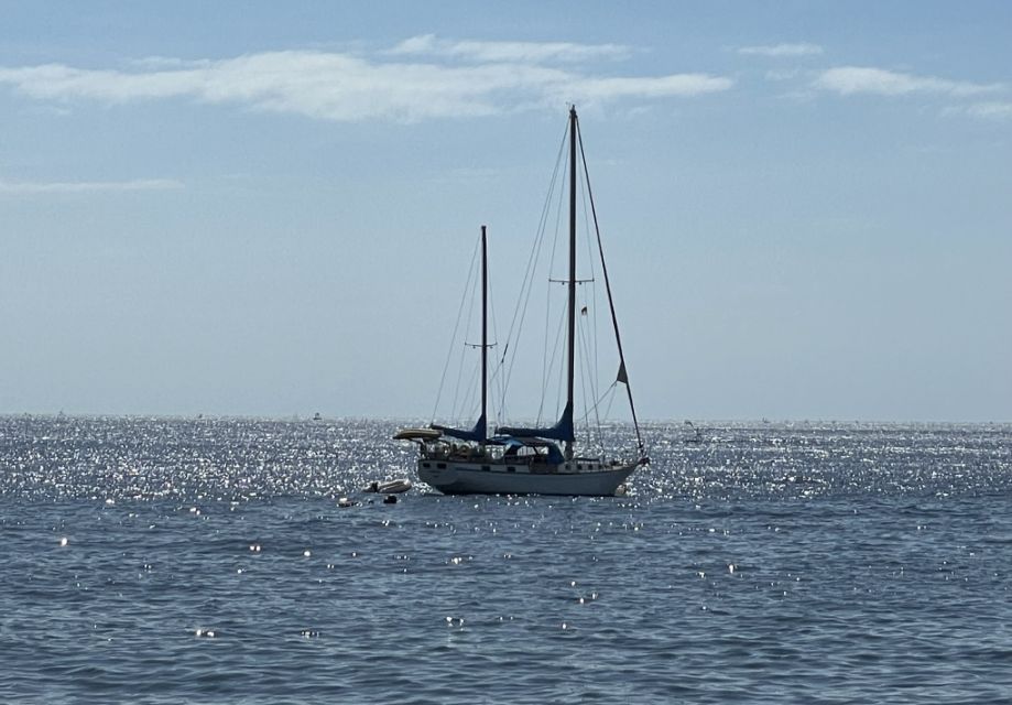 Out on the water, a different scene was unfolding. A tour boat was anchored just offshore, and around it floated a cluster of people wearing life vests. They bobbed gently in the calm sea, likely snorkeling or preparing to dive, adding a soft sense of activity without disturbing the overall stillness.