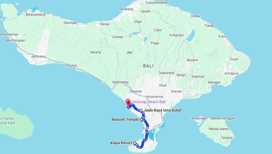 Uluwatu is all the way at the bottom of the map and we are now going North to Canggu