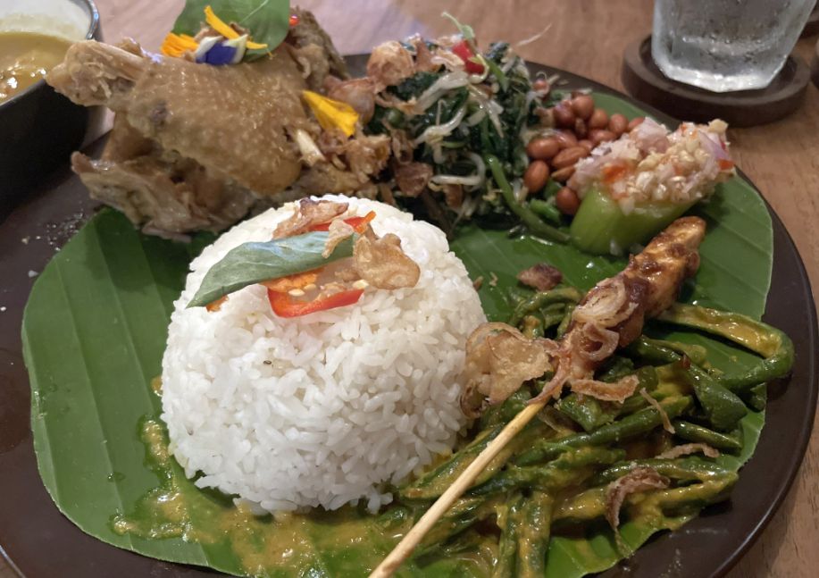 Nasi Champur is a classic Indonesian dish that literally means “mixed rice.” It’s a plate of steamed white rice served with a variety of small side dishes, so every bite gives you a different flavor and texture. The dish includ a chicken sate skewer, vegetables, sambal (Spicy chili paste), crispy crackers, and roasted duck.