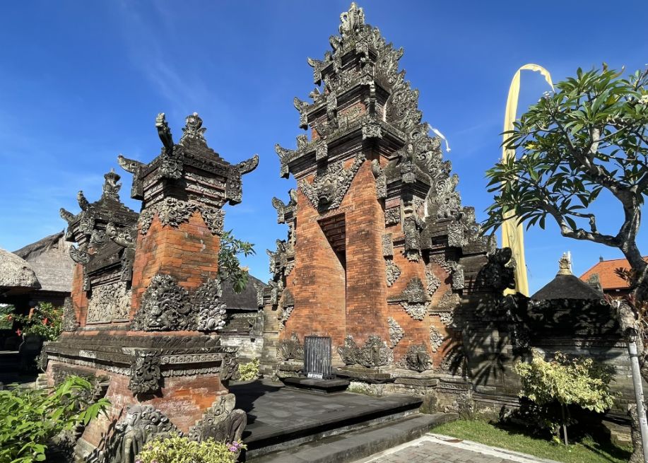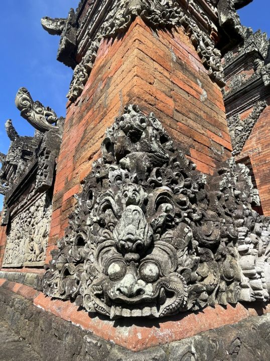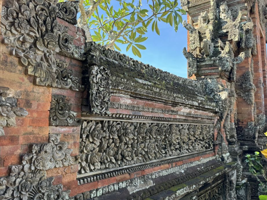 All around, the walls and gateways are covered in intricate carvings on red brick and volcanic stone. These carvings include floral patterns, mythical creatures, gods, demons, and swirling motifs. They show the classic Batuan style, dense, detailed, almost every inch filled with patterns. The red brick gives everything a warm, ancient look, especially when the carvings catch the sunlight.