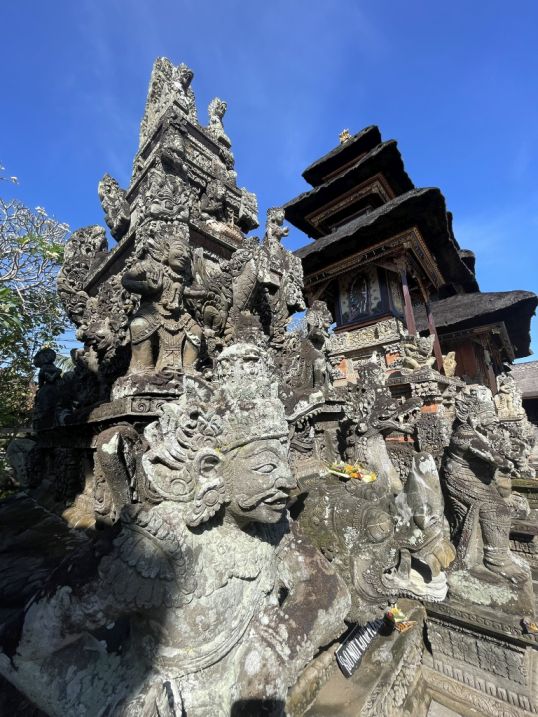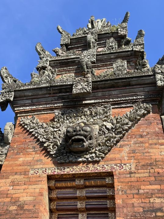 Kala head carvings, symbolizing time, protection, and purification. These features show the classical Balinese style from centuries ago, still beautifully preserved in Batuan Temple.