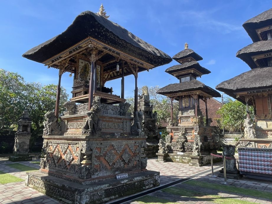 A meru shine is a multi-tiered shrine dedicated to important gods, ancestral spirits, or powerful deities. It’s named after Mount Meru, the sacred cosmic mountain in Hindu-Buddhist cosmology. The three tiers of roof has spiritul meaning and represent Tri Murti (Brahma, Vishnu, Shiva).