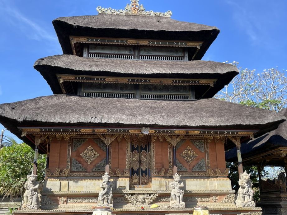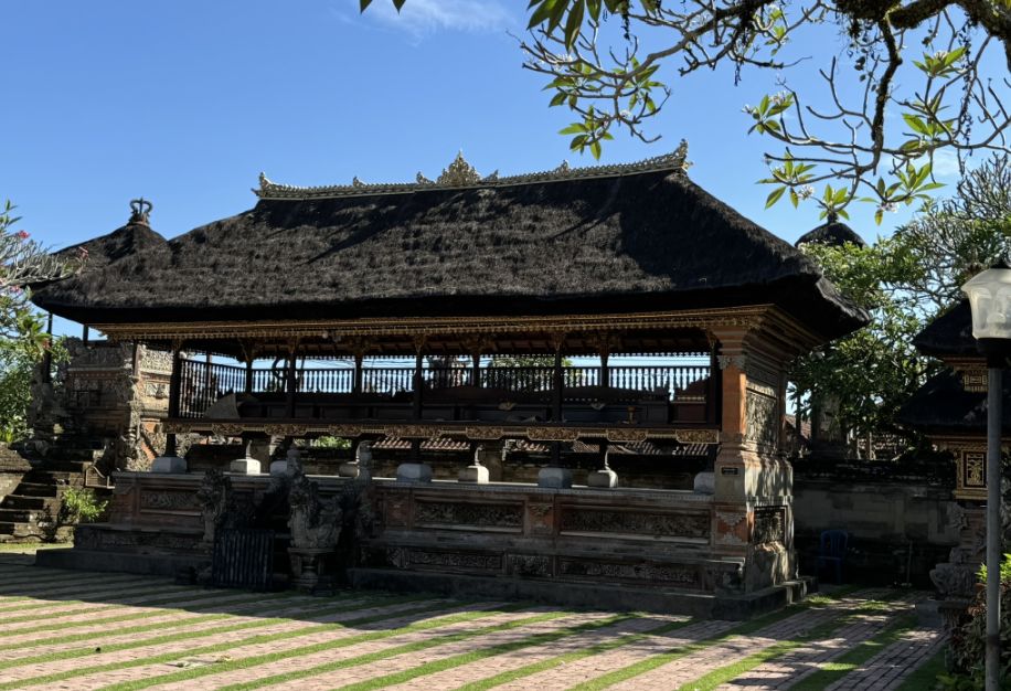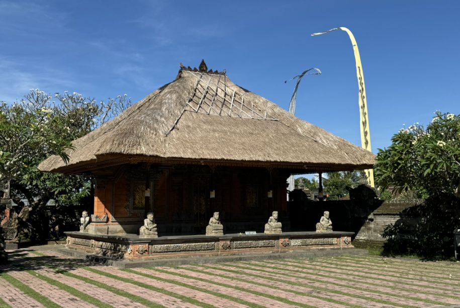 One of the first buildings is the elevated pavilion with a thatched roof made from dried alang-alang grass. This type of structure is often used for ceremonies or offerings. The platform lifts it above the ground to keep it pure, and the wooden pillars are carved with traditional patterns. It feels simple yet sacred, blending naturally into the temple surroundings.