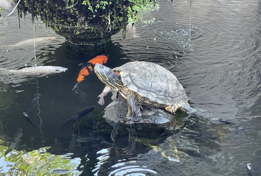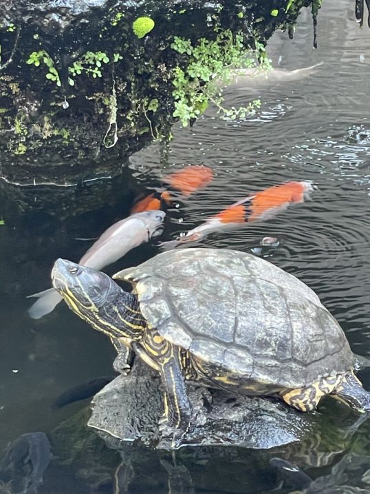 Goldfish gliding gently through the water, their orange bodies bright against the dark pond, and the turtle just stay there enjoying his place on the rock.