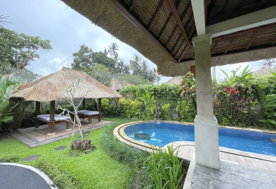 On the left, the private swimming pool stretches along the path. The water looks perfectly still and inviting. It feels close enough that you could dip your hand in as you walk by. The pool gives the villa that unmistakable Ubud luxury vibe, private, quiet, surrounded by nature.