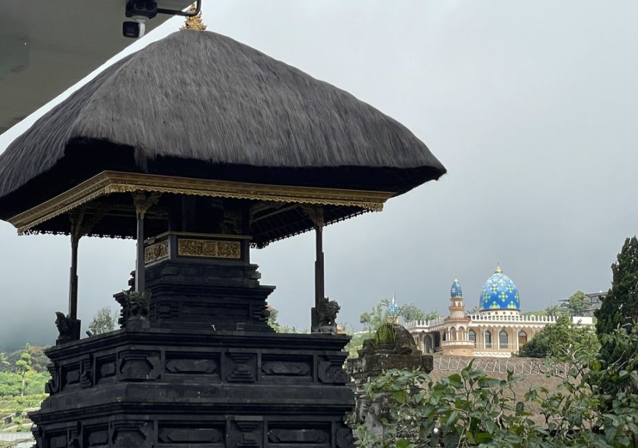 Balinese mosques often adopt local architectural features, and this one stands out because of its layered, pagoda-like roof (influenced by Balinese and Javanese styles). It’s a unique view: a Hindu water temple in the foreground and a vibrantly decorated mosque roof rising behind it, together creating a harmonious cultural scene.