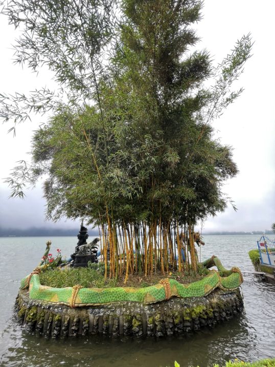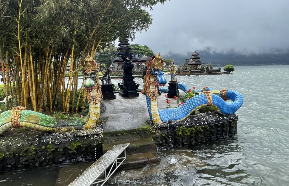As we walked closer to the lakeshore at Ulun Danu Beratan, the cemented round platform with the blue-and-green dragon figure is one of the small lakeside shrines built slightly offshore. It adds a dramatic, almost floating appearance to the temple scenery.