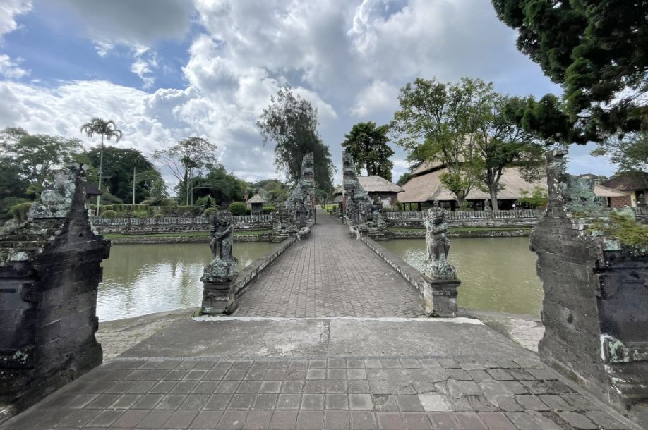 At the far end of the bridge stands another candi bentar, a traditional Balinese split gate.