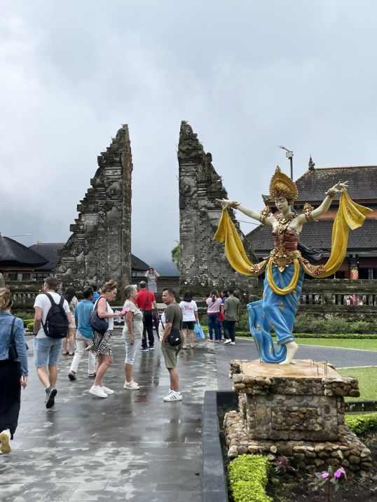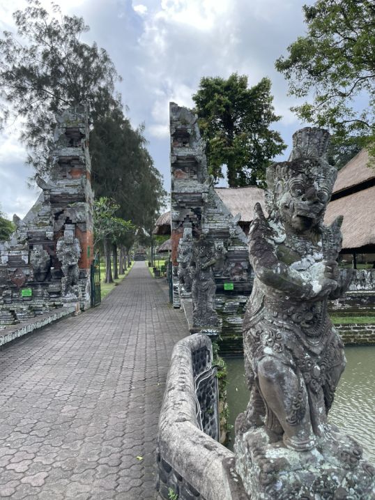 These statues are some of the most vibrant in Bali. Ahead is the main split gate, the iconic Balinese candi bentar.
