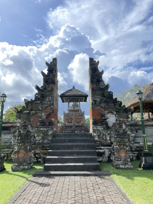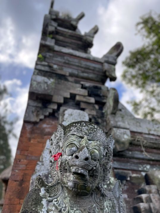 The candi bentar gate, a split stone gateway that marks the boundary between different temple zones. At the entrance stand two guardian statues (dwarapala), they are wrapped in black-and-white checkered sarongs (saput poleng), which symbolize Duality and balance (good/evil, light/dark) and Protection, the guardians watch over the area and ward off negative energy.