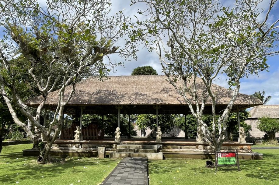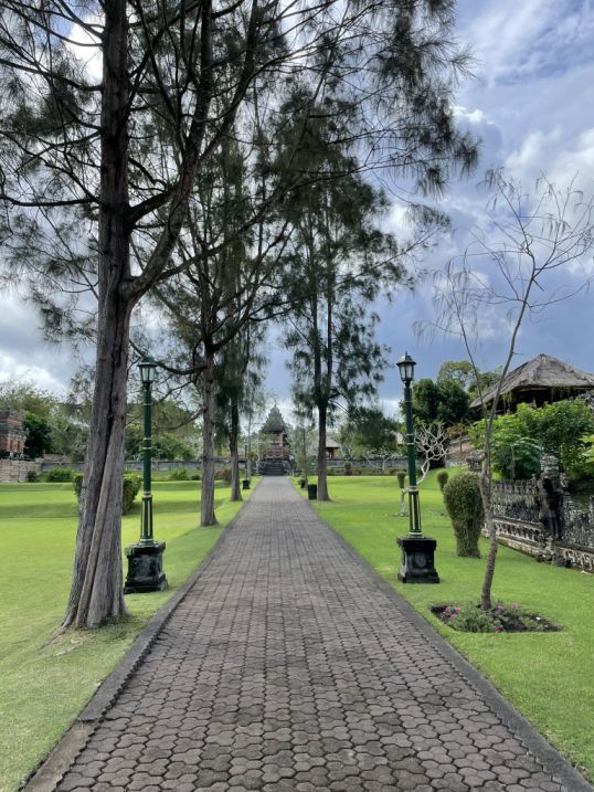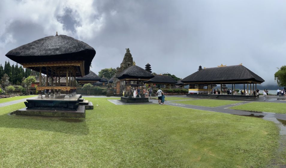 As we stepped into a wide, open grassy area with Lake Beratan shimmering on the right, the three open buildings with thatched roofs are classic Balinese bale, traditional pavilions that serve ceremonial and communal purposes.