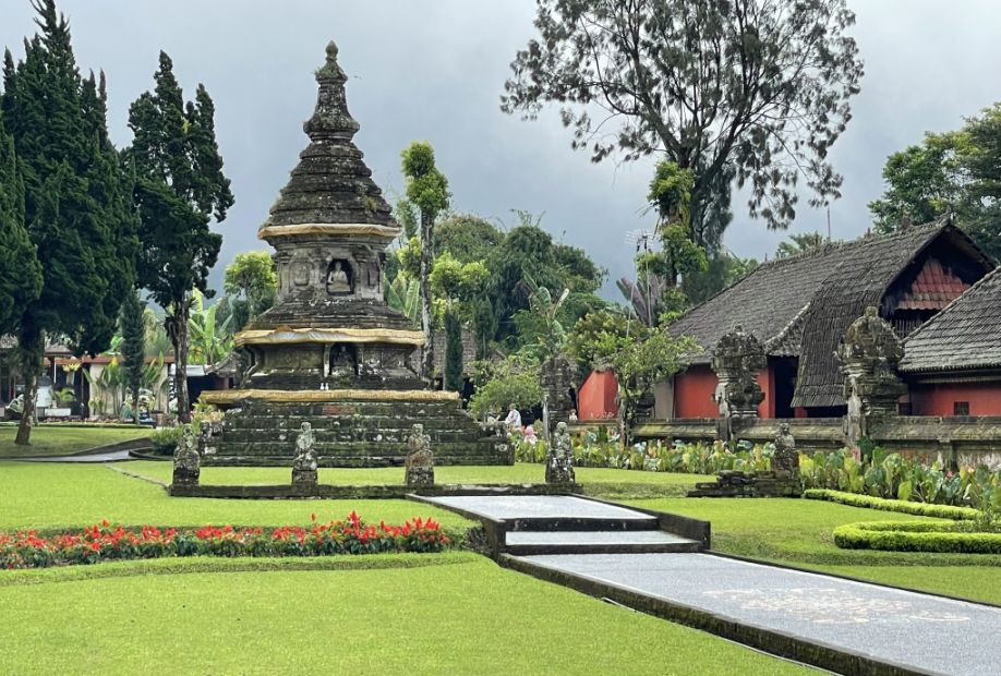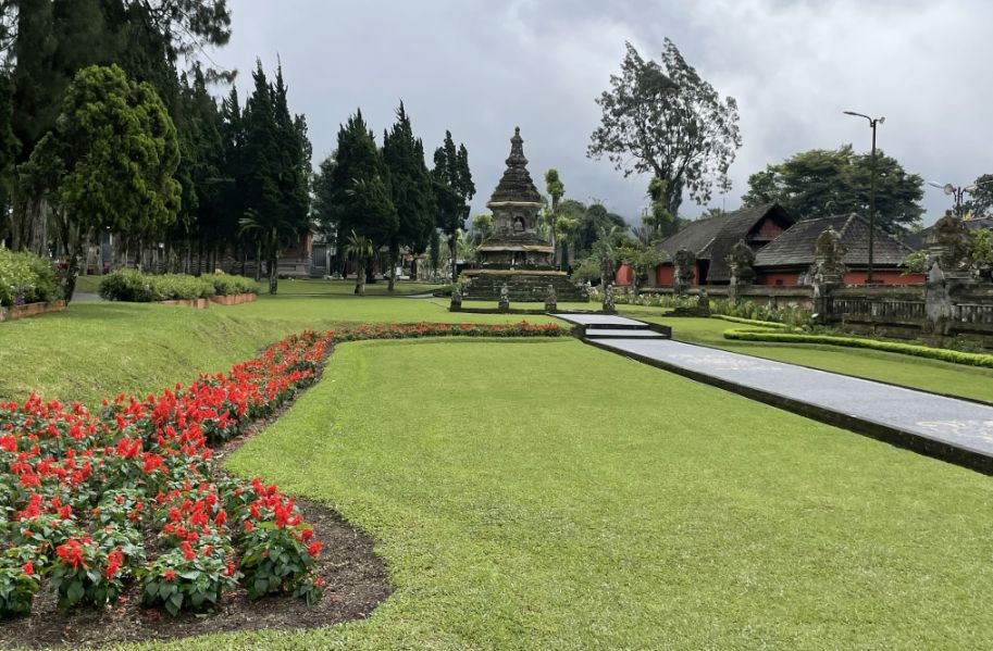 Inside Pura Ulun Danu Beratan, the atmosphere quickly becomes serene and almost park-like, with wide manicured lawns that make the sacred compounds feel open and airy. The gardens are intentionally maintained this way, Balinese temple grounds often use carefully kept grass and flowering plants to create a sense of purity before visitors approach the holiest areas.